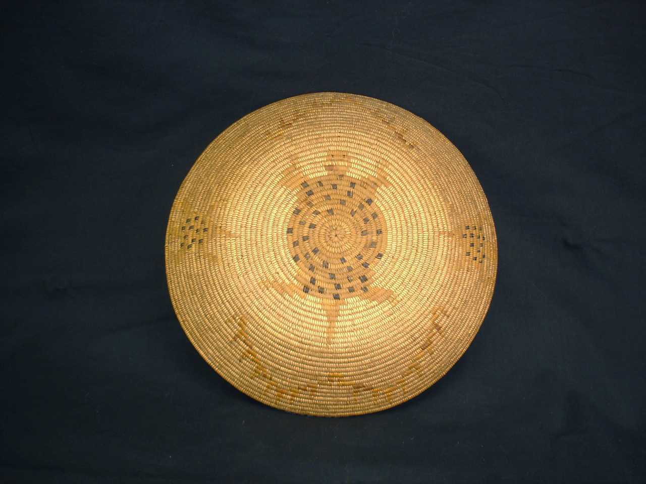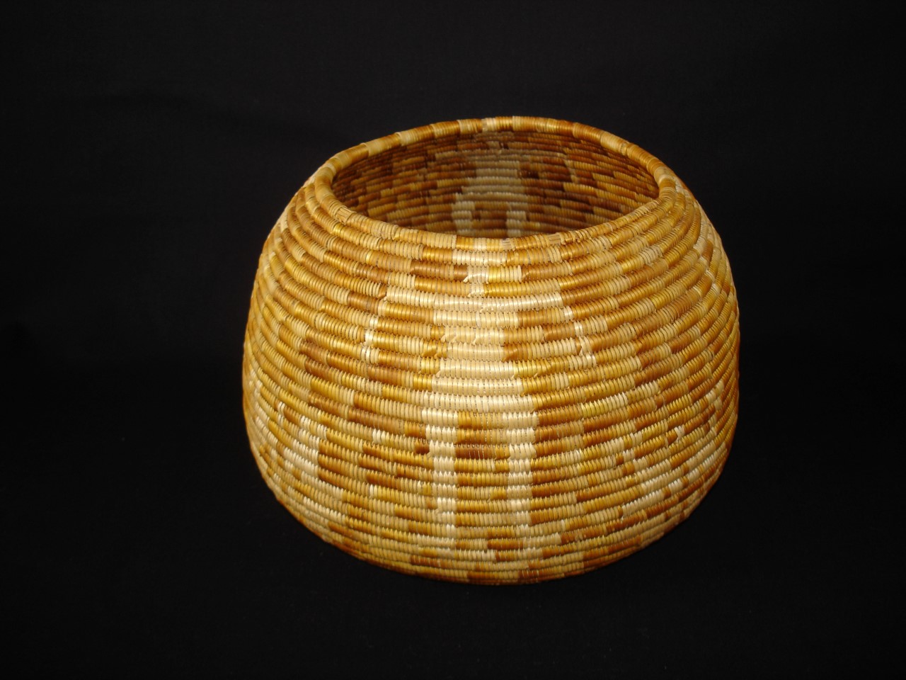 Decorating the shoulder of the basket are men and women friendship figures, holding hands and dancing the friendship dance. The sides are decorated with a polychrome design. The basket has been on display at the Rancho Los Alamites History Museum in Long Beach, California.