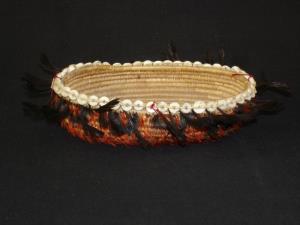 This oval feathered Pomo basket has a complete row of clam shells with top knots going around the rim. The sides and bottom are covered with red, blue and black feathers. In nice condition for its age.